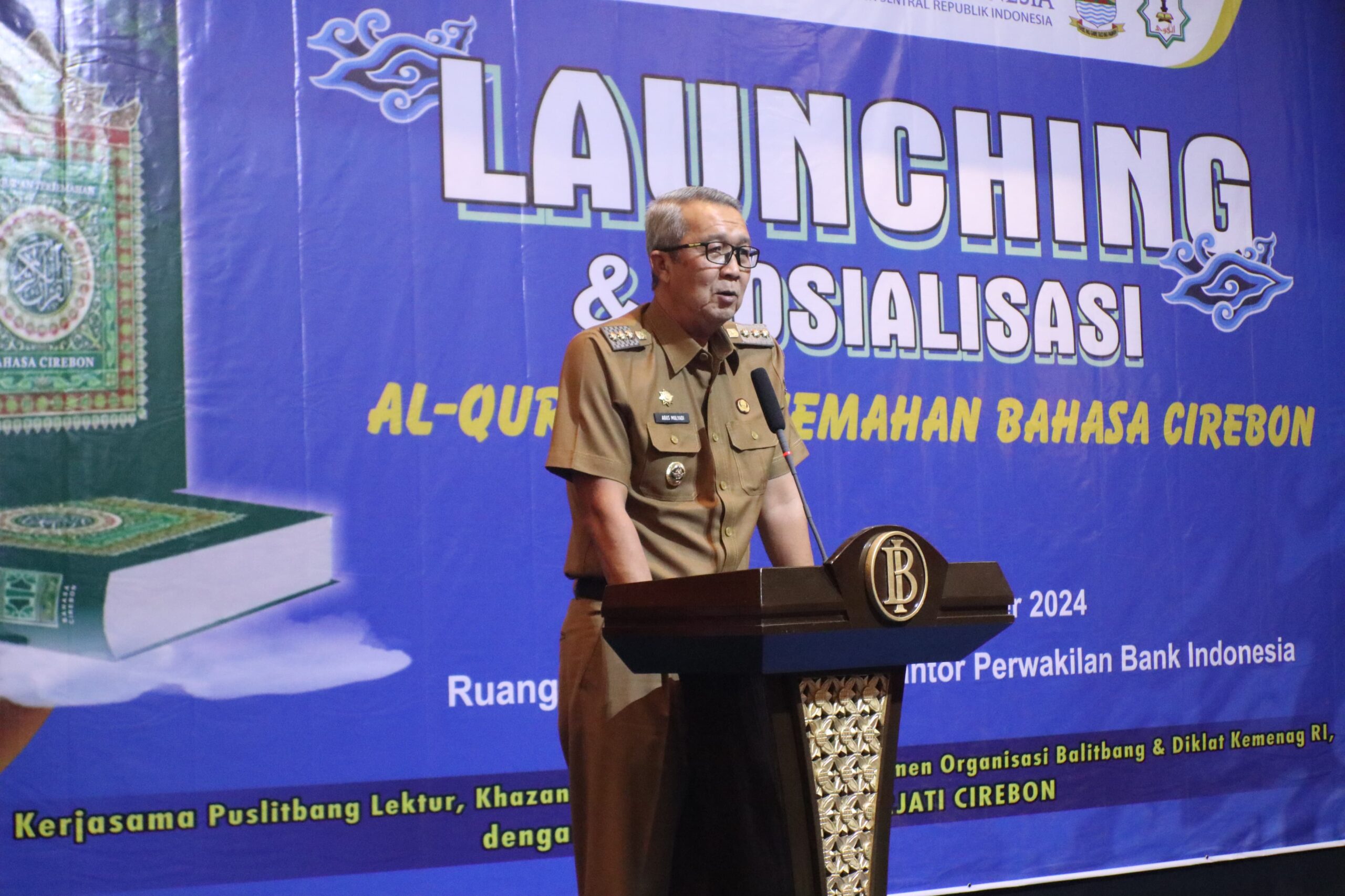 Cirebon- Pj Wali Kota Cirebon, Drs H Agus Mulyadi MSi menghadiri peluncuran sekaligus sosialisasi Al-Quran terjemahan Bahasa Cirebon yang diadakan di Kantor Perwakilan Bank Indonesia Cirebon, Selasa (29/10/2024).